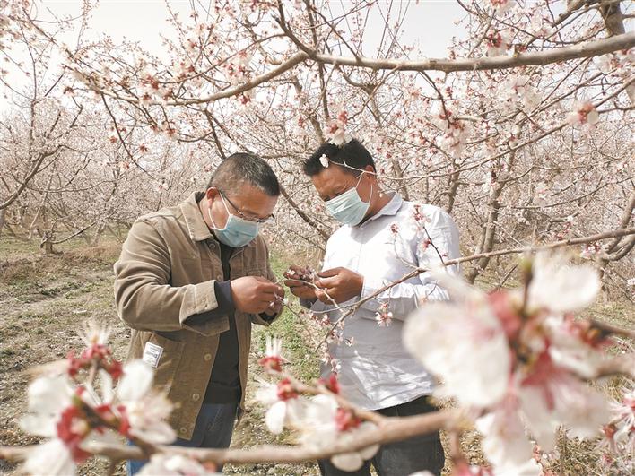 4月13日,一师四团三连党支部书记陈俊业(左)与沈铁柱查看杏花授粉情况。 李桃 摄