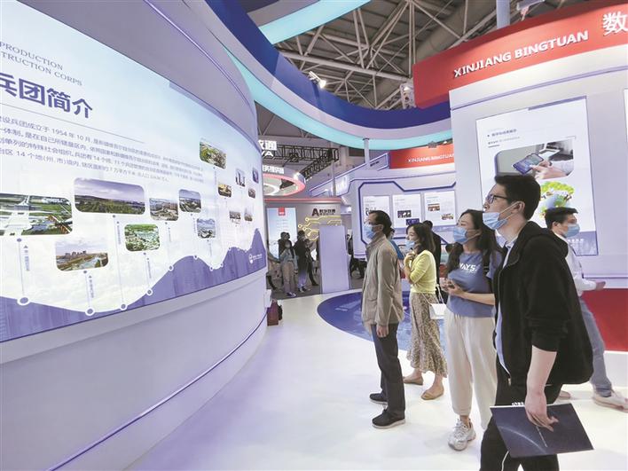 4月25日,第四届数字中国建设峰会在福建省福州市开幕,兵团应邀参加,集中展示电子政务和数字产业发展成果。图为参观者在兵团展区观展。兵团日报记者 赵珺 摄