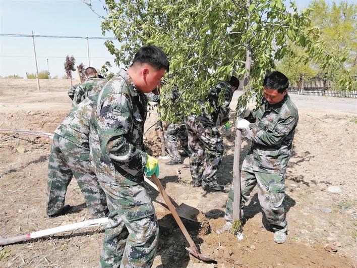 一二三团十三连职工群众在栽植景观树,美化连队环境(资料图片)。邹杰 提供