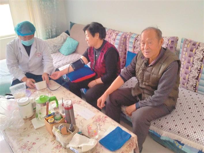 11月20日,八师一四九团三社区卫生服务站医生魏作江(左)来到居民家中,为慢性病患者做健康检查。 魏喜喜 摄