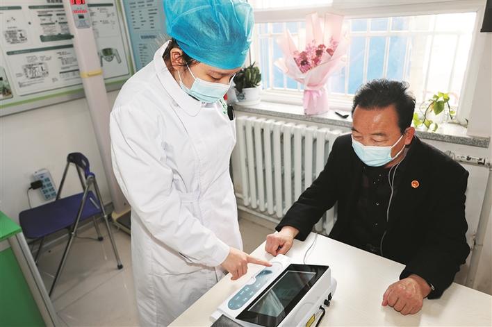 4月8日,八师石河子市5-1社区卫生服务站医生王鹏(左)为慢性病居民测量血压,将测量值实时上传至“八师医疗”APP平台。 顾明月 摄