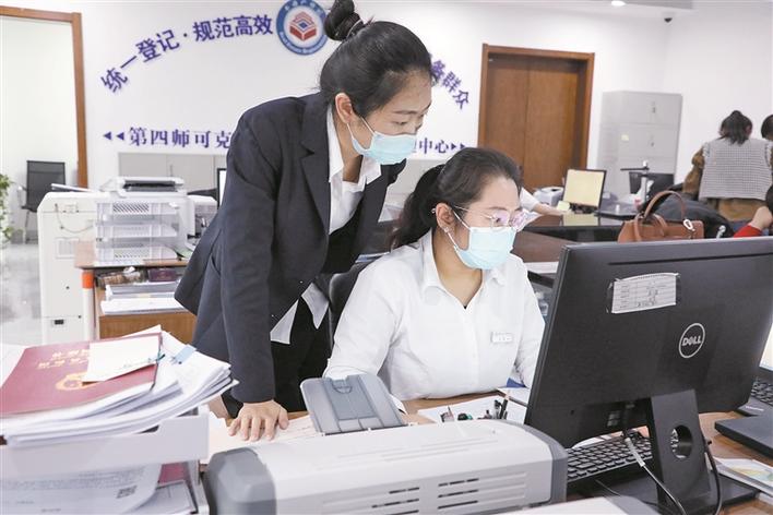 可克达拉市政务服务中心工作人员在录入服务信息(摄于4月2日)。杨俊钦 摄