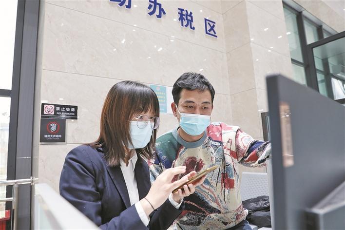 两位市民在可克达拉市政务服务中心自助办税(摄于4月2日)。杨俊钦 摄