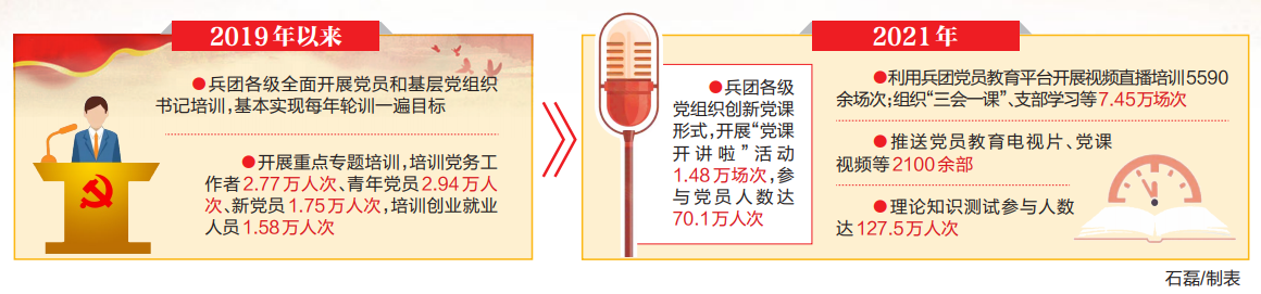 2021年,围绕庆祝建党100周年和党史学习教育等重大主题,兵团各级广泛开展“党课开讲啦”“学习身边榜样”等活动。兵团党委组织部开办“党课开讲啦”电视专栏,制播《铸牢中华民族共同体意识》《兵团精神》等精品党课视频18部,征集基层党课视频500余部在各主流媒体展播。各级党组织创新党课形式,开展“党课开讲啦”活动1.48万场次,参与党员人数达70.1万人次。