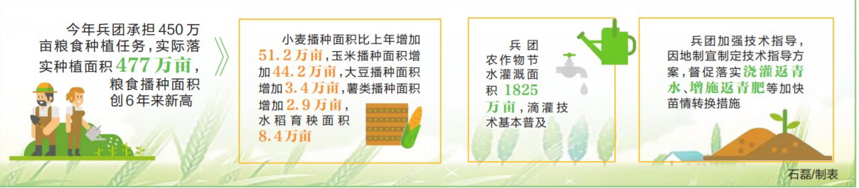 今年,兵团承担了450万亩粮食种植任务,实际落实种植面积477万亩,粮食播种面积创6年来新高。其中,小麦播种面积比上年增加51.2万亩,玉米播种面积增加44.2万亩,大豆播种面积增加3.4万亩,薯类播种面积增加2.9万亩,水稻育秧面积8.4万亩。