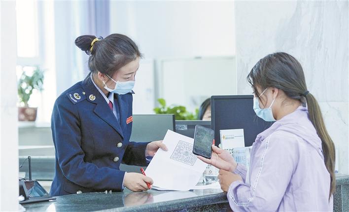 在国家税务总局北屯税务局办税服务厅,工作人员指导纳税人扫二维码办理业务(资料图片)。近年来,北屯税务局持续开展“便民办税春风行动”,在实现“一厅通办”“一窗通办”“一网通办”的基础上,大力推行容缺受理、项目管家等服务,进一步提升服务效能。 兵团日报全媒体记者 陈洋 摄