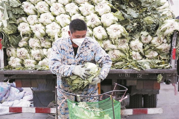 新疆九鼎农产品批发交易市场商户在整理刚刚运抵的大白菜(资料图片)。作为新疆最大的农副产品批发交易市场,九鼎市场采取切实措施确保市场运行通畅、安全、高效,牢牢稳住了全疆的“菜篮子”“果盘子”。 赵林洁 摄