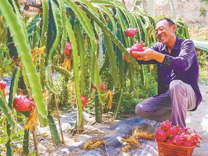 二师二十九团九连种植户李武召在大棚里采摘火龙果(资料图片)。近年,二十九团立足自身实际,大力发展特色果品种植等富民产业,满足了当地消费市场需求,跑出乡村振兴“加速度”。刁翔 摄