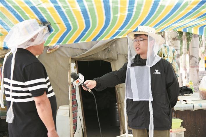 服务于三师融媒体中心的西部计划志愿者黄斌(右)在三师四十八团河东镇采访“养蜂人”(资料图片)。三师融媒体中心 提供