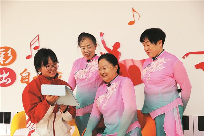 3月3日,服务于一师五团文体广电旅游中心的西部计划志愿者罗秋萍(左一)与团场文艺骨干交流舞台妆的设计,以实际行动助力基层文化事业发展。 李康 摄