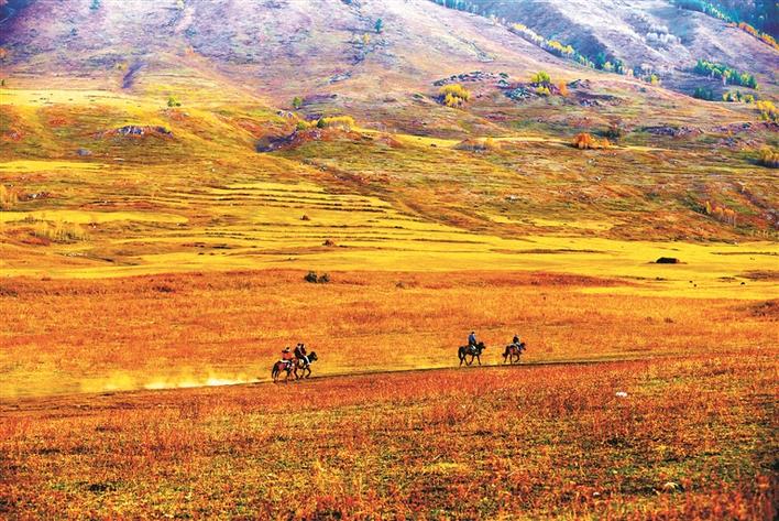 禾木景区里游客骑着骏马缓缓前行(图片资料)。邱兴明 摄