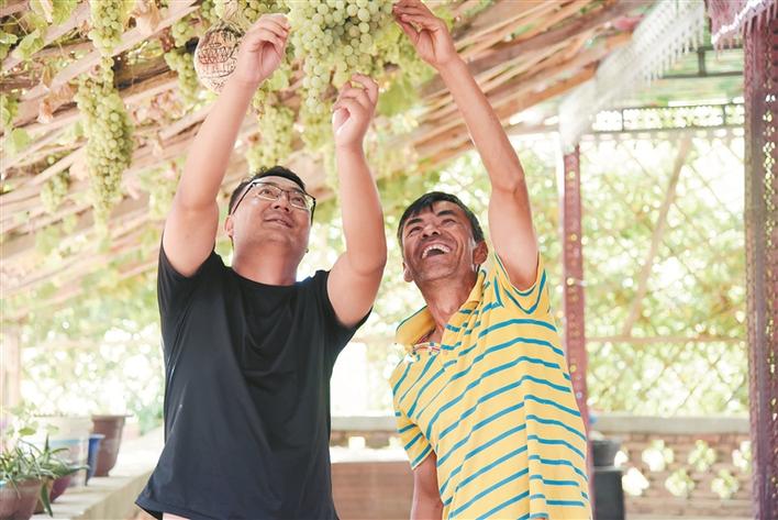 在三师五十三团二连民族团结大院里,连队“两委”成员(左)和居民一起采摘成熟的葡萄(资料图片)。
