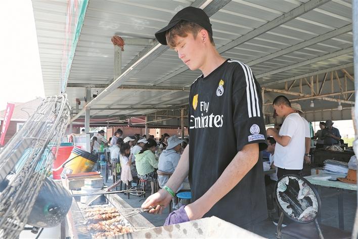 九月二十四日,在十师一八八团布伦托海海滨度假旅游区,商户正在为顾客烤羊肉串。 张智 摄