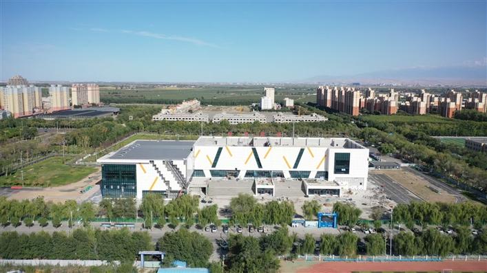 鸟瞰六师五家渠市全民健身中心续建项目施工现场(摄于9月20日)。杜仪 朱小丽 摄
