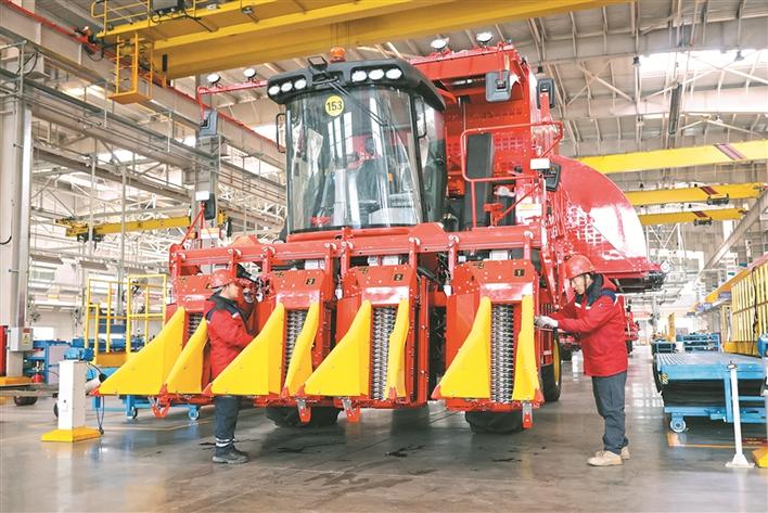 在新疆天鹅现代农业机械装备有限公司生产车间,工人们加紧生产采棉机(资料图片)。作为兵团农机装备产业链“链主”企业、国家级重点专精特新“小巨人”企业,该公司成功研发的六行自走式打包采棉机畅销国内市场,批量出口至中亚与南美地区。 兵团日报常驻记者 李华北 摄