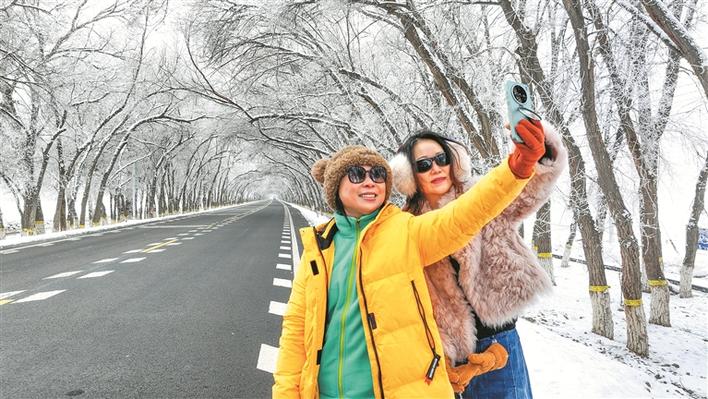 2025年12月23日,游客在四师六十七团与雾凇景观合影留念。 兵团日报常驻记者 杨俊钦 摄